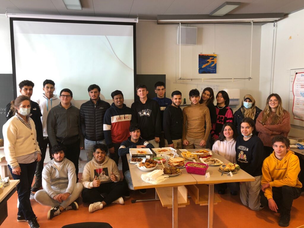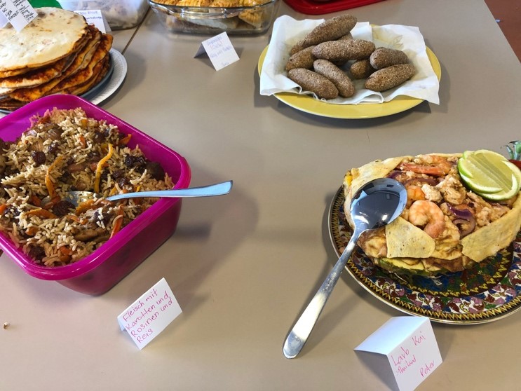 Nach einigen Lektionen zu den Themen Lebensmittel, Ernährung und Gesundheit schritt die Klasse zum praktischen und erst noch speziell genussvollen Teil des Projektes. Alle Lernenden hatten ihr persönliches Lieblingsrezept aus ihrem Herkunftsland mit der Klasse geteilt sowie das Essen auf einen bestimmten Tag zu Hause zubereitet und mit in den Unterricht gebracht. So kamen Köstlichkeiten aus aller Welt zusammen. Mit dem feinen Essen aus vielen verschiedenen Ländern, wie Brasilien, Portugal, Italien, Syrien, Afghanistan oder Sri Lanka, und Kulturen fühlte man sich wie an einem internationalen Food Festival. Das Essen hat allen toll geschmeckt, man hat sich ausgetauscht, die Rezepte nachgeschlagen, angeschaut, erzählt, gelacht und miteinander gegessen. Die Nahrungsaufnahme wurde damit zu einem sozialen Ereignis, das ungemein verbindet. Das Strahlen in den Augen jedes Einzelnen, so abwechslungsreich zu essen und von seiner Herkunft zu berichten und damit ein Stück eigene Heimat in den Unterricht zu bringen, brachte Geborgenheit und Wohlfühlmomente ins Klassenzimmer.